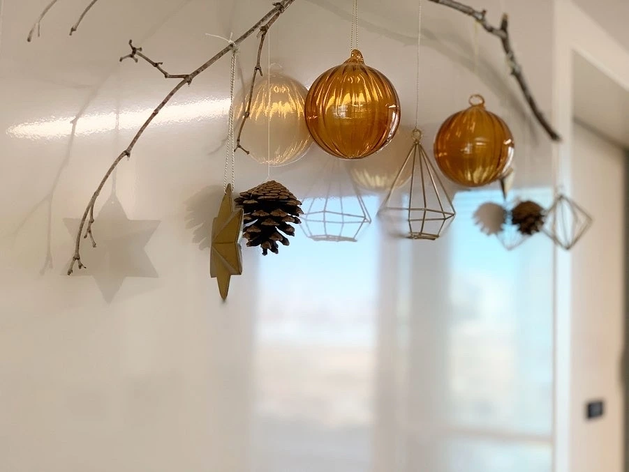 아파트 단지에서 가지치기한 날 주워온 나뭇가지와 반짝이지 않는 오너먼트, 솔방울로 간단하게 꾸민 크리스마스 가랜드가 트리를 대신한다. 자리를 차지하지 않아 좋다.