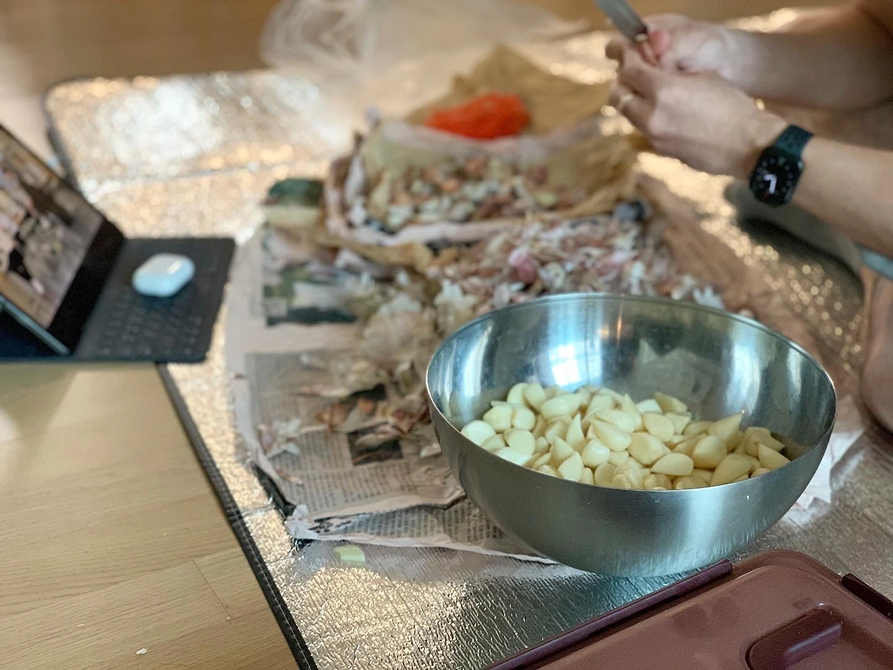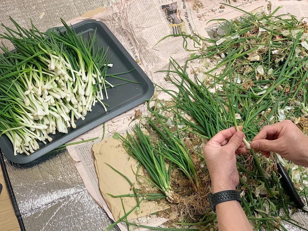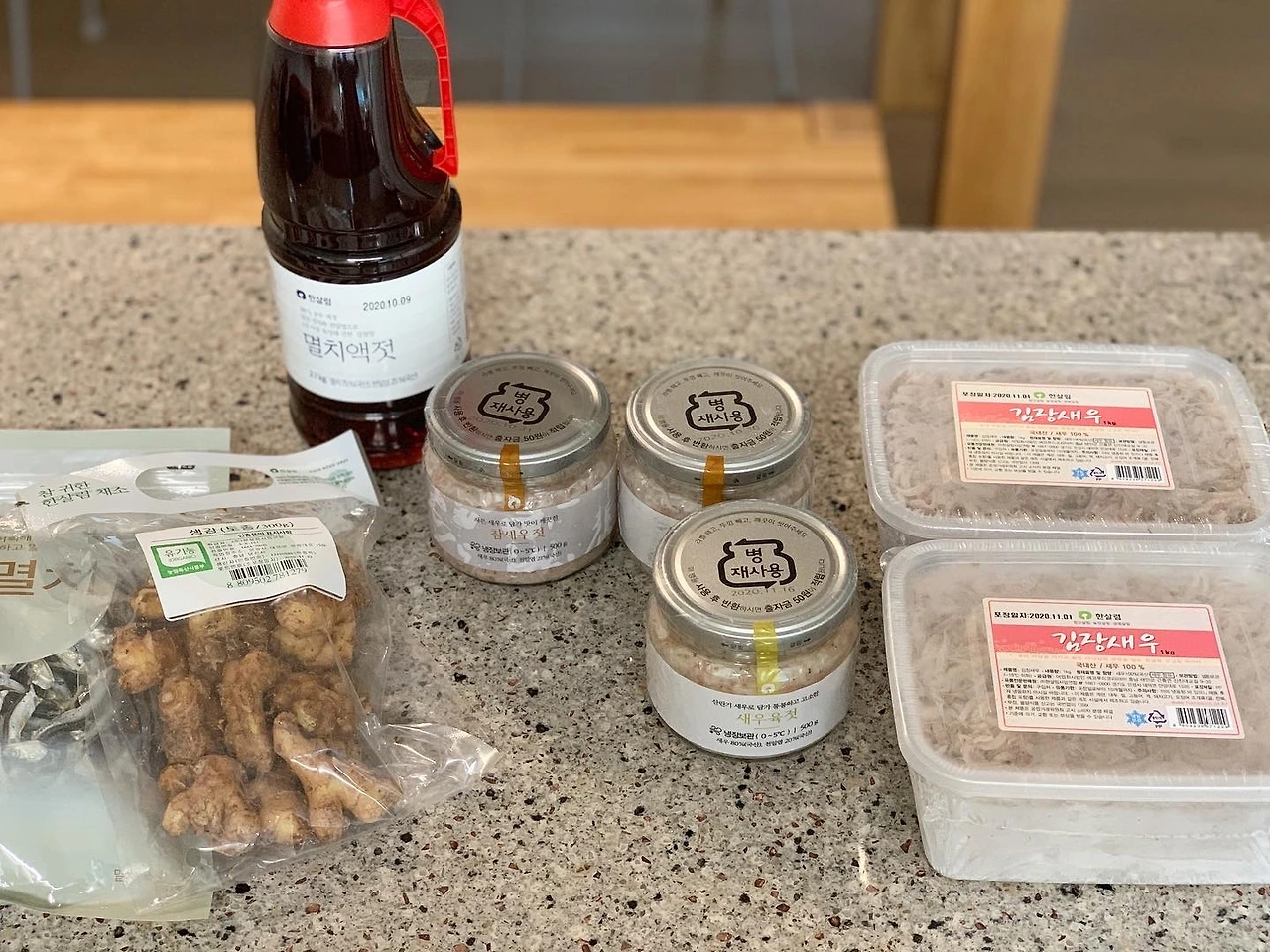 전날 마늘과 생강을 다듬고 찧어둔다. 손이 많이 가는 쪽파와 대파를 다듬고 생새우의 이물질을 골라내고 멸치액젓을 부어 둔다. 멸치액젓을 미리 부어두면 생새우의 변질을 막을 수 있다.