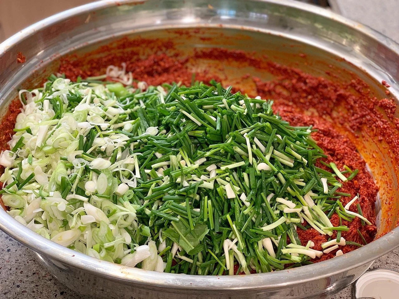 무채가 숨이 죽으면 쪽파, 대파, 청갓, 적갓을 양념에 모두 넣어 섞는다.