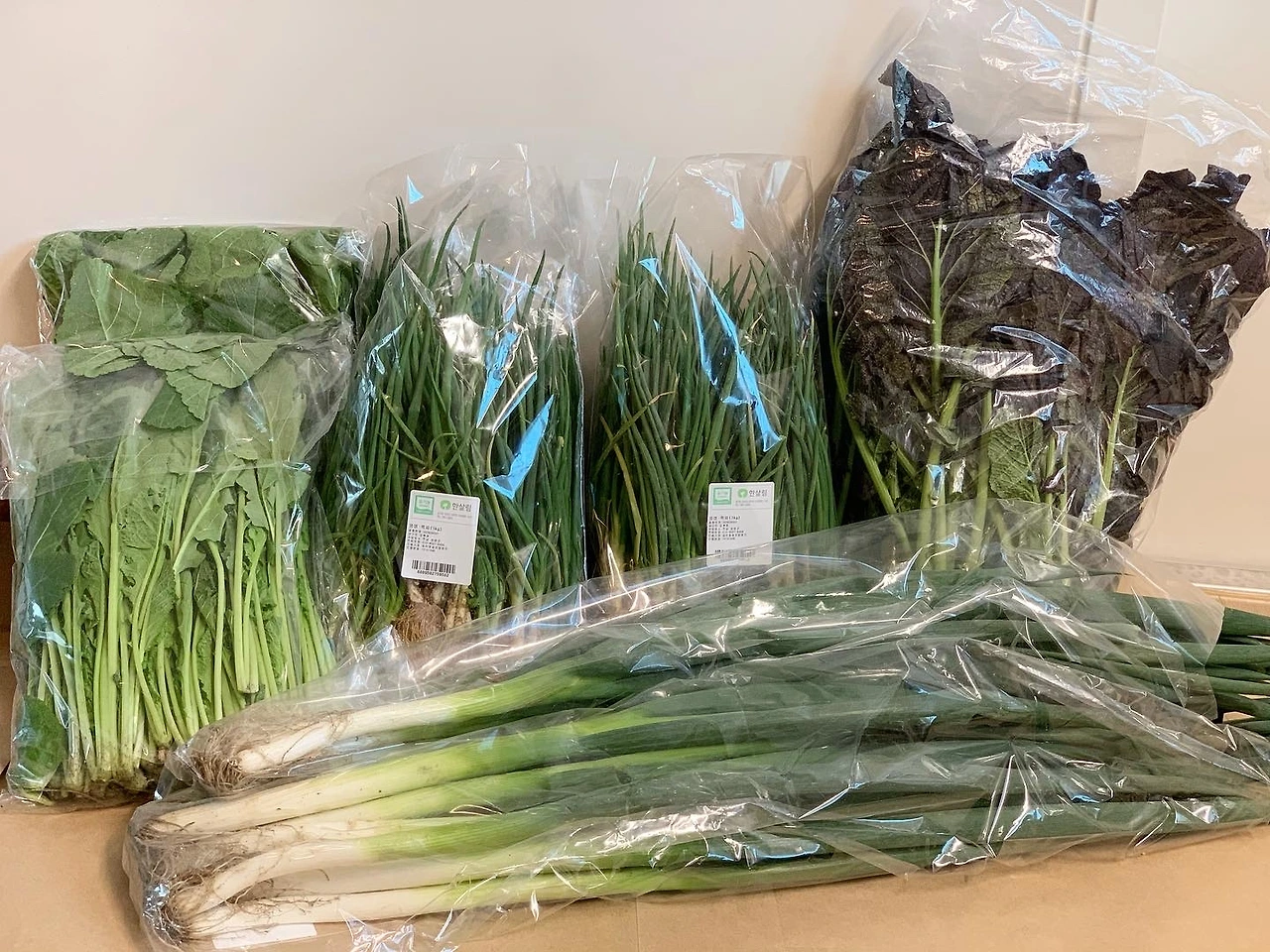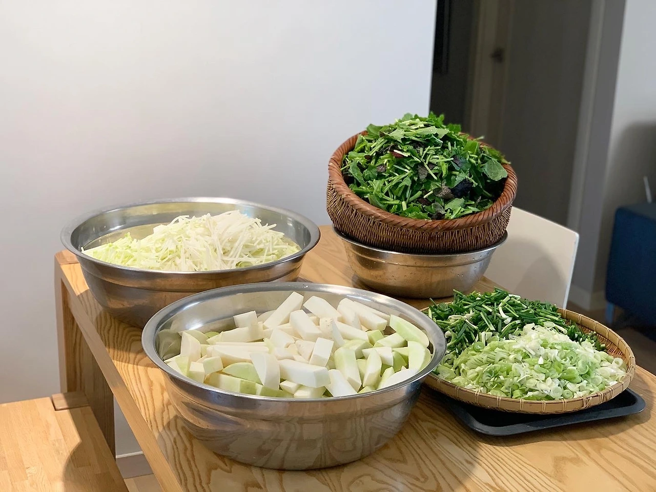 둘째 날, 절임 배추와 무가 도착하면 배추를 씻어 물기를 빼두고 무채와 토막 무를 길쭉하게 썰어둔다. 청갓과 적갓을 씻어 적당한 크기로 자르고 쪽파와 대파도 썰어둔다.