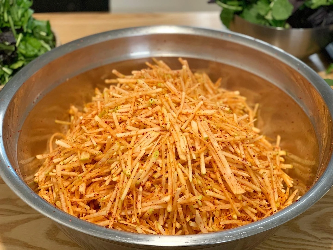 채 썬 무채는 곱게 고춧가루로 물을 들여 양념과 버무린다.