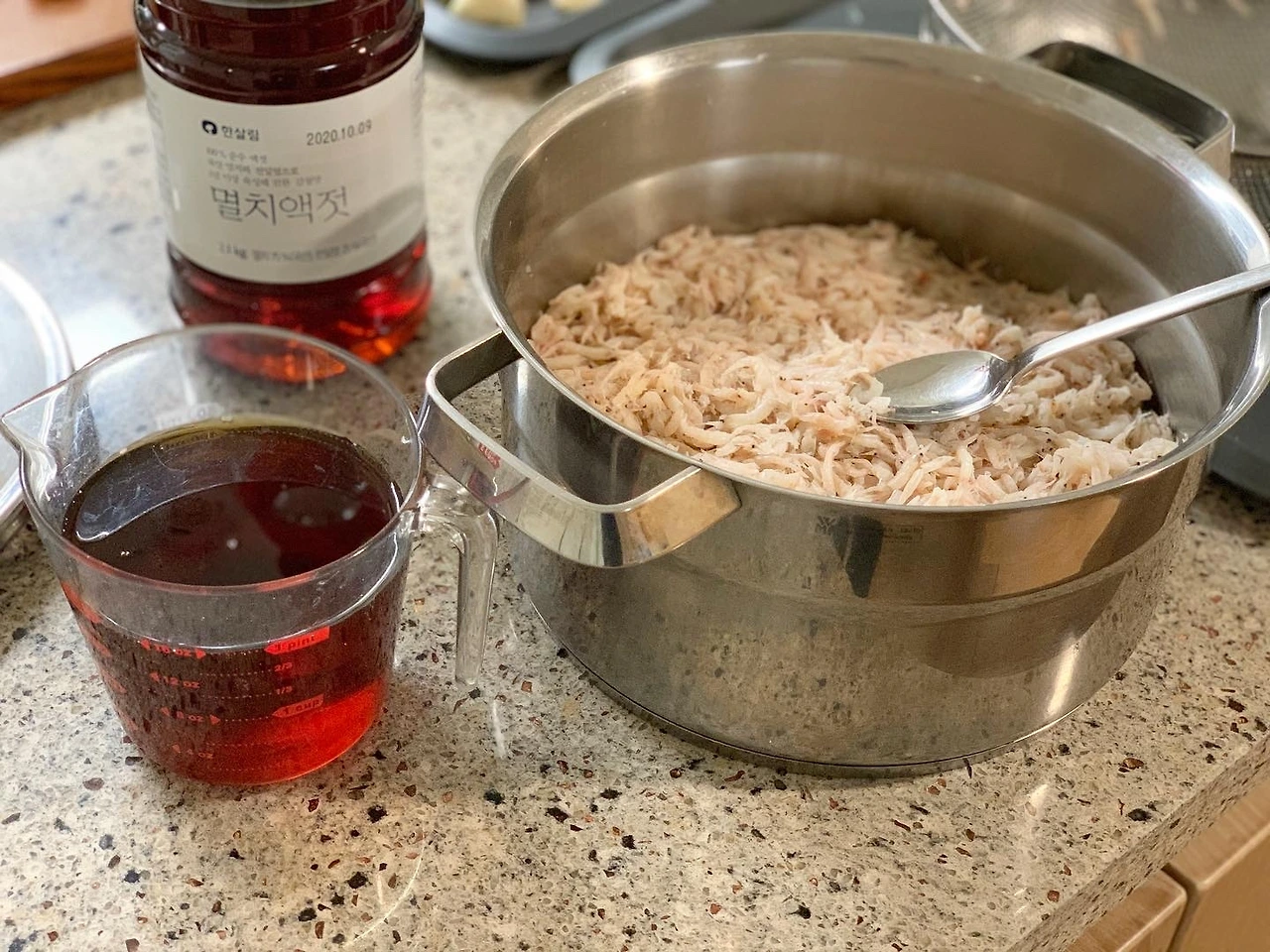 생새우나 새우젓은 다지거나 갈 필요가 없다. 찹쌀풀도 마찬가지이다. 찹쌀 알갱이가 보여도 나중에 모두 삭기 때문에 갈지 않아도 상관없다. 양념에 버무리면 모두 쉽게 삭는다.