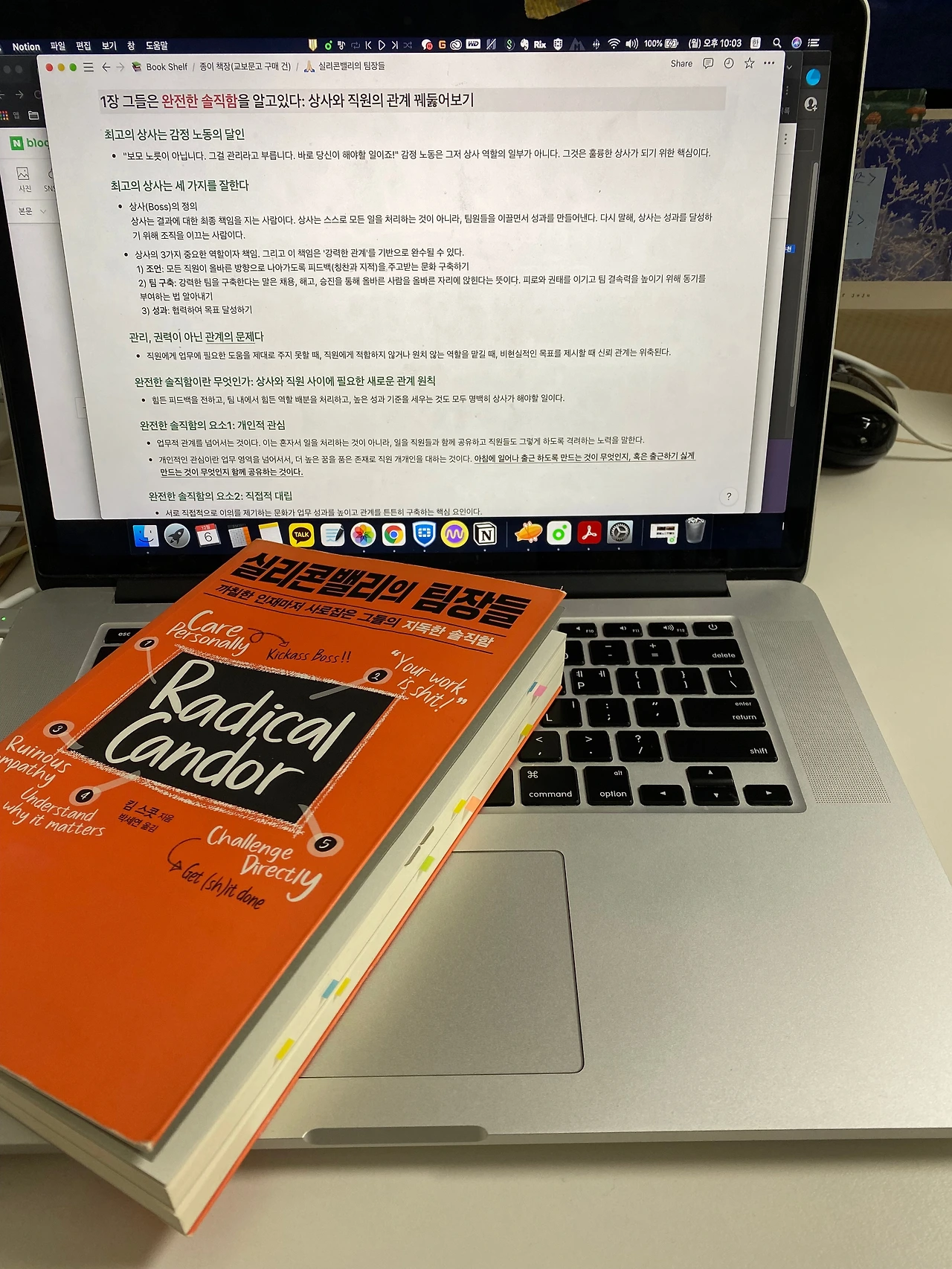이 책이 팀장을 타깃으로 쓰인 책이긴 하지만, 리더든 구성원이든 더 나은 조직을 만들고 성과를 내기 위해 읽어보길 추천한다. 구성원이 되어 읽는 2번째 느끼는 바는, '내가 상사를 어떻게 도울 수 있을까?', '현재 겪고 있는 어려움을 상사에게 솔직하게 이야기하고 있는가?' 그런 질문들이다. 그냥 흘려 읽지 말고 두세 번 읽고 밑줄 치고 적용하고 질문하고 뜯고 씹어먹어 보려고 한다. 조직이 커지면 더 커질수록 어렵고 또 어렵다.