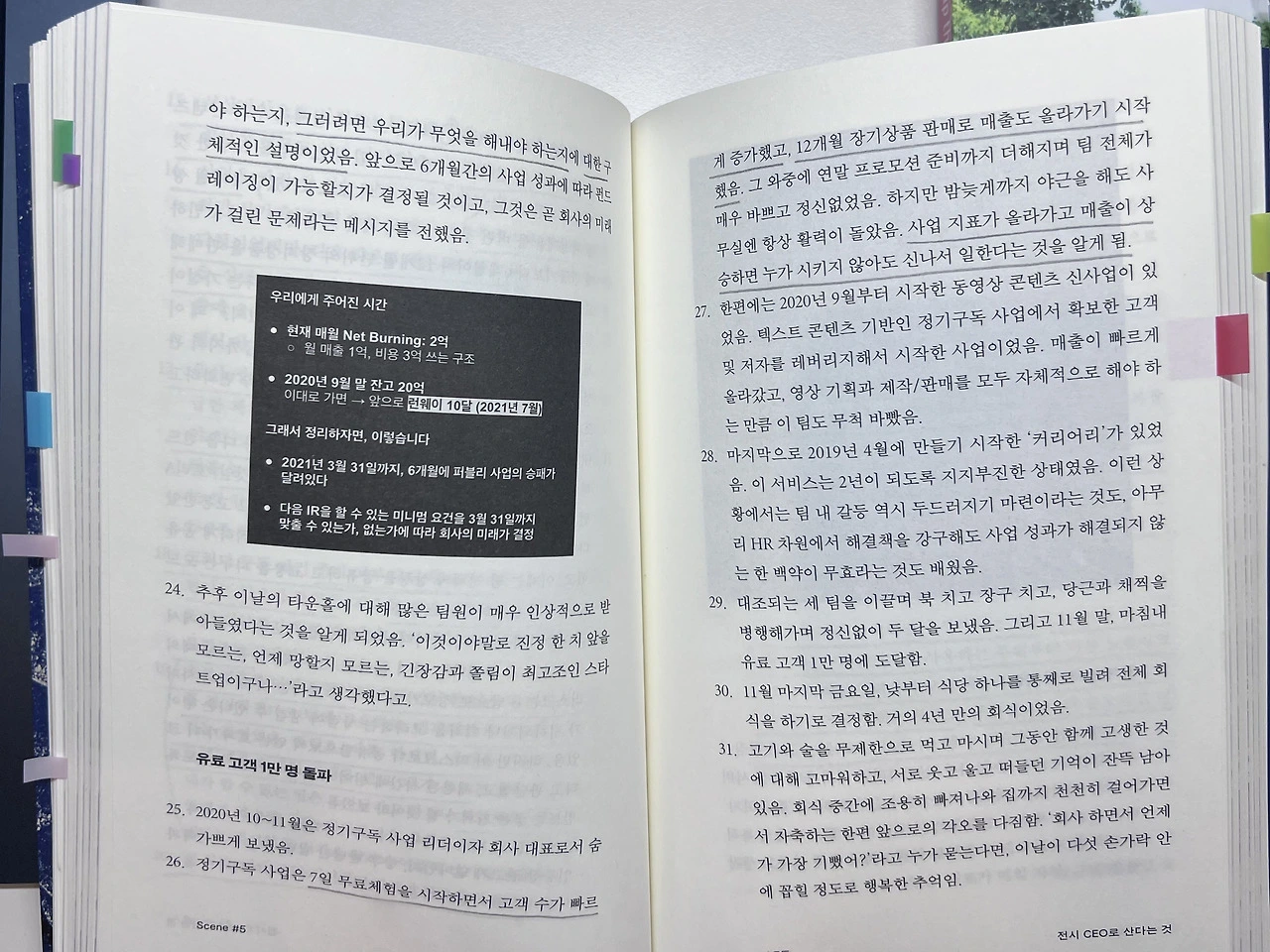 정말 많은 문장에 밑줄을 그으면서 읽었지만 마케터로서 무엇보다 공감했던 문장은 “한 칸 한 칸 숫자를 입력하면서 생각하는 것은 그래프를 눈으로 확인하는 것과 뇌를 사용하는 부위부터 다른 느낌이었음. 숫자를 직접 입력하다 보니 매출과 비용, 중요한 지표들이 모두 내 손안에 잡히는 듯했고, 무슨 숫자가 더 중요하고 덜 중요한지, 앞으로 무엇을 더 해야 하는지도 정리되었음"이라는 부분입니다.