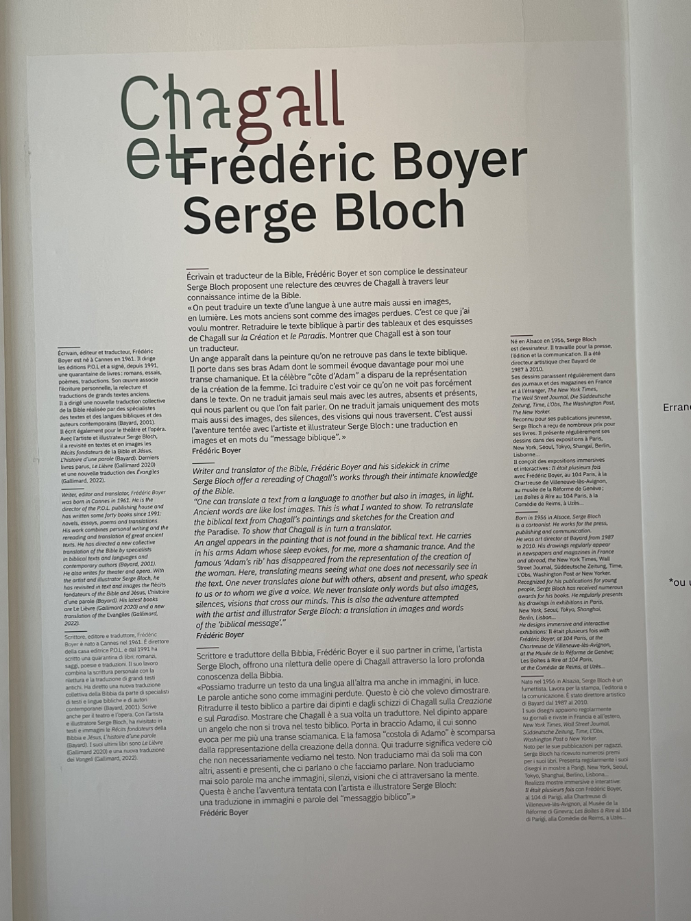 프레드릭과 세르쥐는 그들의 감각과 색깔을 담은 성경을 제작했고, 태초에 하느님이 7일 동안 세상을 만들었다는 창세기의 한 장면을 볼 수 있었다. 그림은 유쾌했고, 글은 경쾌했다. 그들이 작업한 성경(Bible)을 한 권 사 오고 싶다는 생각까지 들 정도였지만 벽돌만 한 두께였기에 박물관에서 보는 것에 만족했다. 샤갈의 작품에서 성서와 관련된 주제를 살펴볼 수 있기에 이들이 작업한 성경이 전시되는 게 아닌가 싶었다.