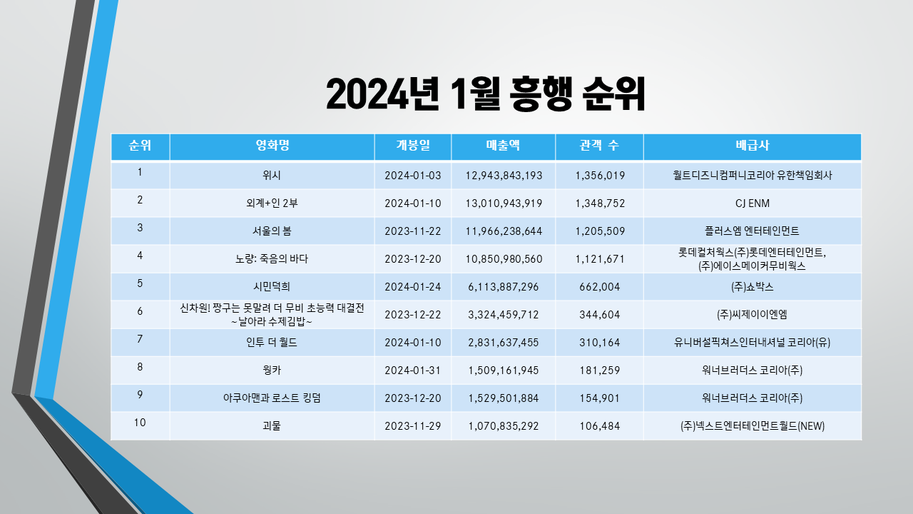 영화진흥위원회(이하 영진위) 영화관입장권통합전산망 기준 2024년 1월 한국 영화산업 박스오피스 통계입니다.