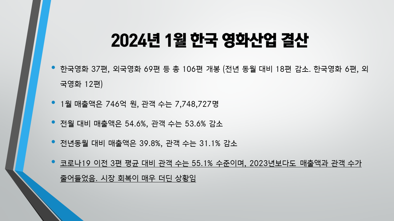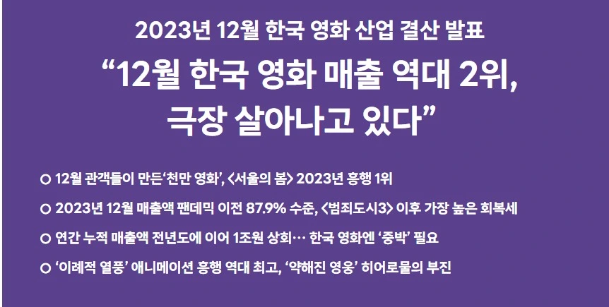 지난 1월 15일 영진위가 '2023년 12월 한국 영화산업 결산'을 발표하면서 "12월 한국영화 매출 역대 2위, 극장 살아나고 있다"라고 분석했지만, 현실은 영진위의 분석과 달랐습니다. 1월 박스오피스는 전월 대비 절반 이하로 감소했습니다.