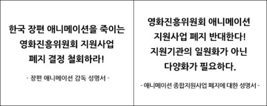 2023년 7월, 2024년 영진위 예산 편성 과정에서 애니메이션 종합지원 사업이 전액 삭감이 확인된 이후, 8월 8일 애니메이션 협단체의 모임인 애니메이션 발전연대는 ‘영진위 애니메이션 지원 사업 폐지에 반대하며 지원기관의 일원화가 아닌 다양화를 요구’하는 성명을 발표했고, 이 성명에는 무려 10,080명이 공감하며 연명했습니다. 그리고 같은 날 김청기, 성백엽, 오성윤, 이성강, 안재훈, 연상호 등 27명의 장편 애니메이션 감독들도 ‘한국 장편애니메이션을 죽이는 영진위 지원 사업 폐지 결정을 철회하라!’는 내용의 성명서를 발표했습니다.