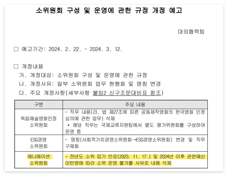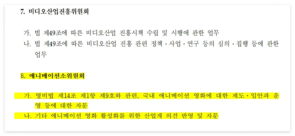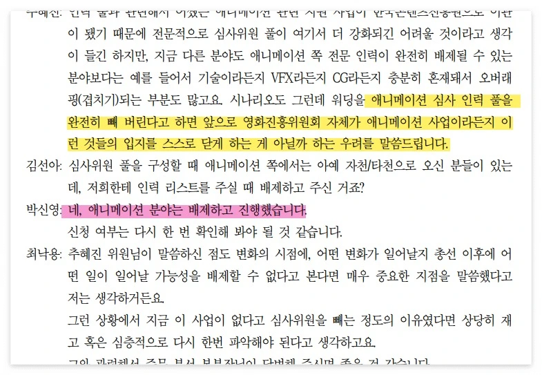 간단하게 말해서 올해 이후 영진위 내에 애니메이션 관련 지원 사업이 없으니 심사위원 풀에도 애니메이션 분야를 없애고 소위원회도 없애겠다는 것인데, 그렇게 간단하게 없애도 되는 건 아닙니다.