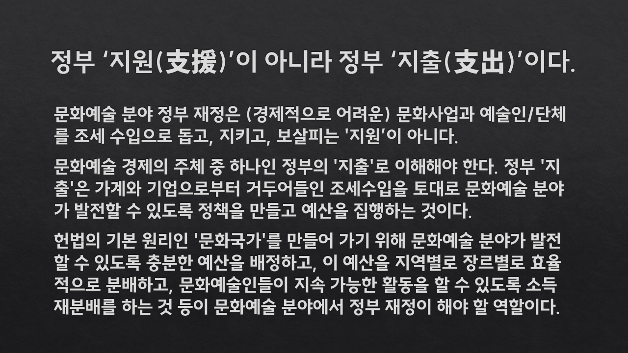 일반회계든 기금이든, 정부 재정은 ‘지원’이 아니라 정부가 당연히 해야 할 역할인 정부의 재정 ‘지출’이다. 누가 누굴 돕는다의 문제가 아니다. 어려우니 누굴 돕고, 독립하겠다는 예술인은 안 돕고, 정부의 정책에 보조를 맞추는 문화예술 사업이나 예술인만 돕겠다는 건 정부가 해야 할 문화예술 재정 지출의 역할이 아니다.
