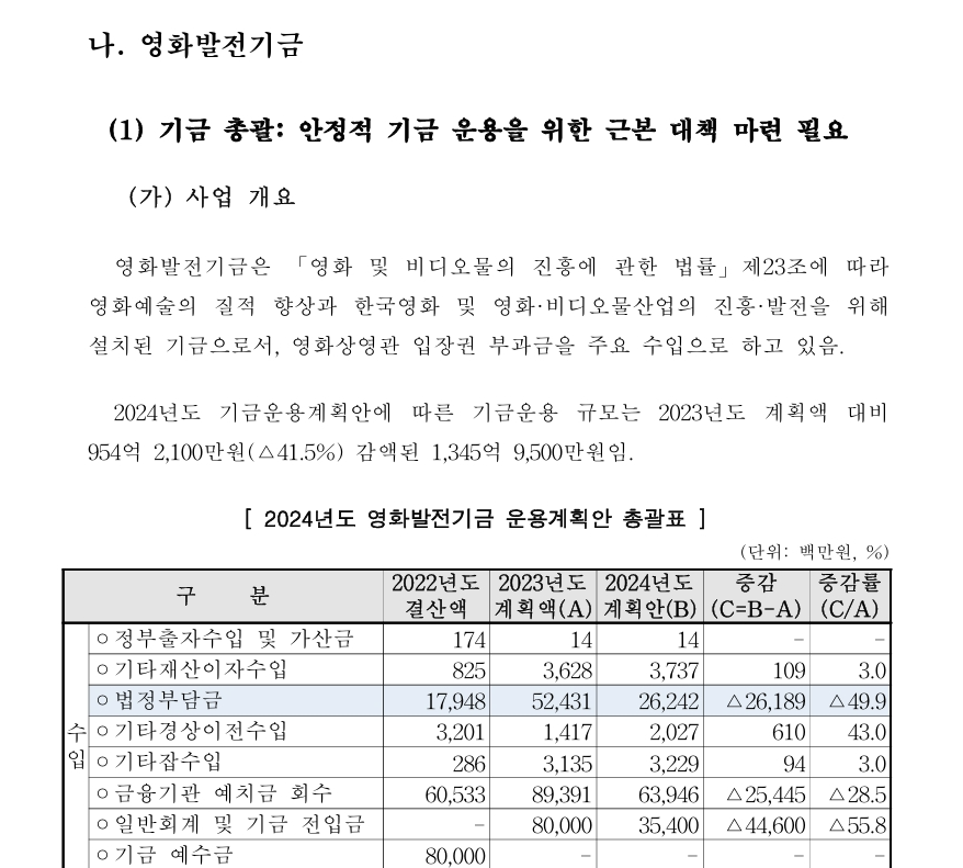 작년 국회에서 영화발전기금 예산안을 논의할 때 국회 문화체육관광위원회 전문위원은 영화발전기금의 '안정적 기금 운용을 위한 근본 대책이 필요하다'는 검토보고를 제출했다. 주요 내용은 "영화산업의 구조적 변화로 영화발전기금의 재원 확보가 점차 어려워지고 있고, 이와 동시에 영화산업의 환경 변화에 적시 대응하기 위한 지원 필요성도 더욱 커지고 있다. 그래서 다각도의 재원 확보 방안 마련을 비롯해 기금의 안정적 운용을 위한 근본적인 대책을 검토할 필요가 있"다는 것이었다.
