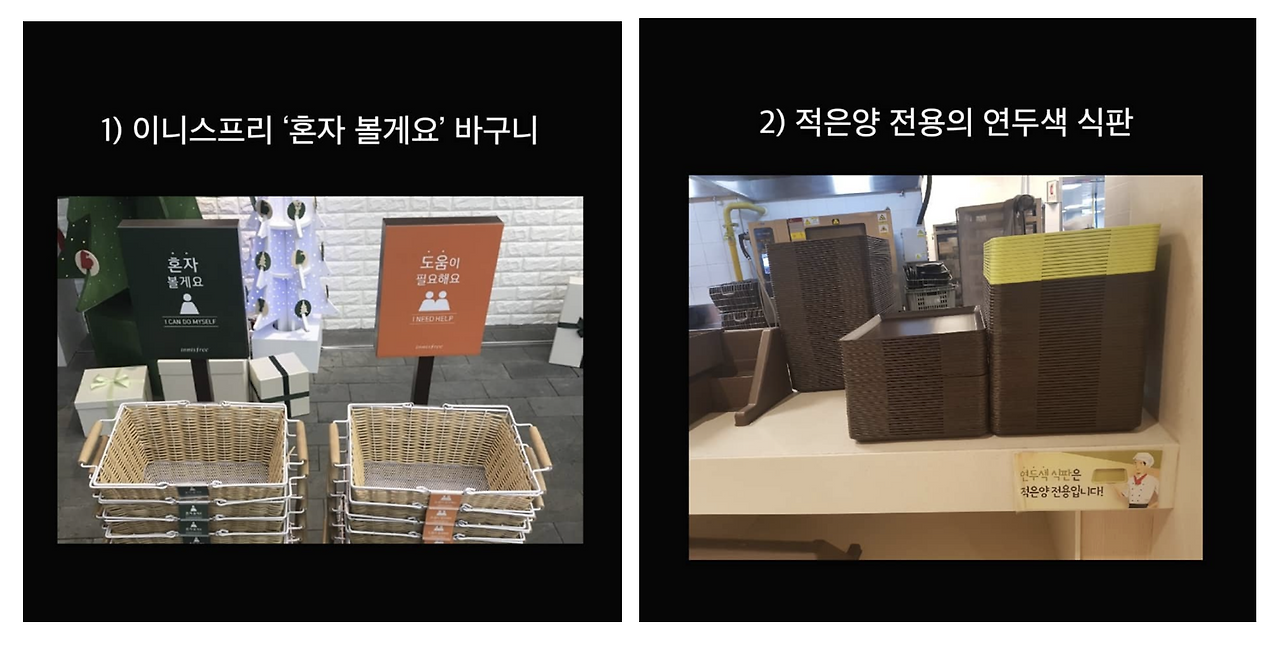 식당 이용 고객이 매번 직원분께 “적게 주세요”라고 의사를 직접 전달하기보다는, 들고 있는 식판 색상을 통해, 알아서 양을 조절해서 주게끔 설계가 되어 있었다.
