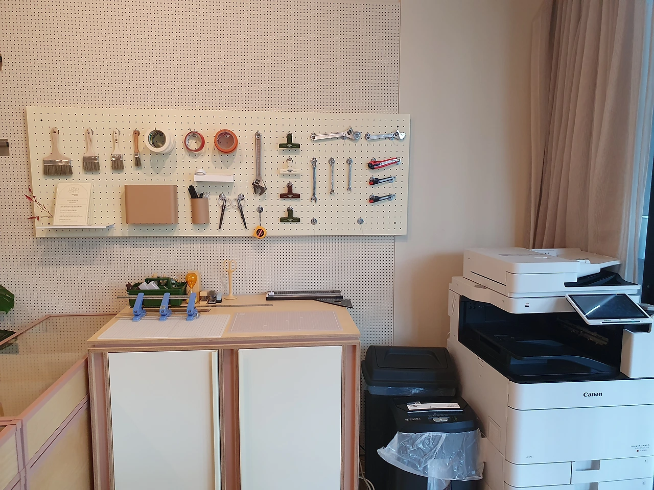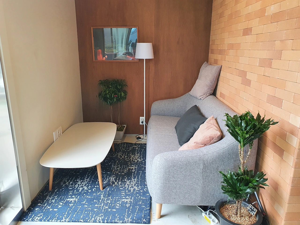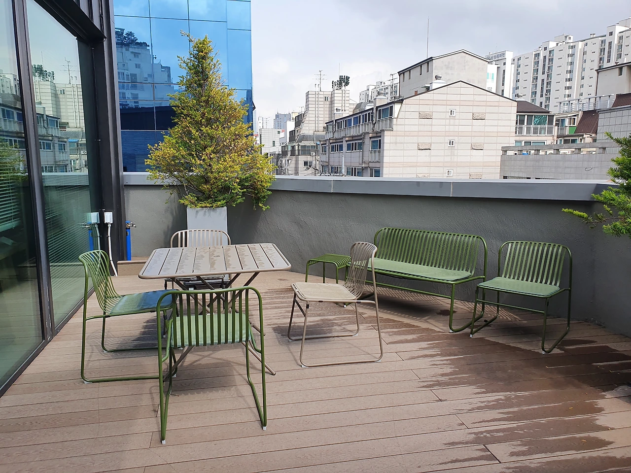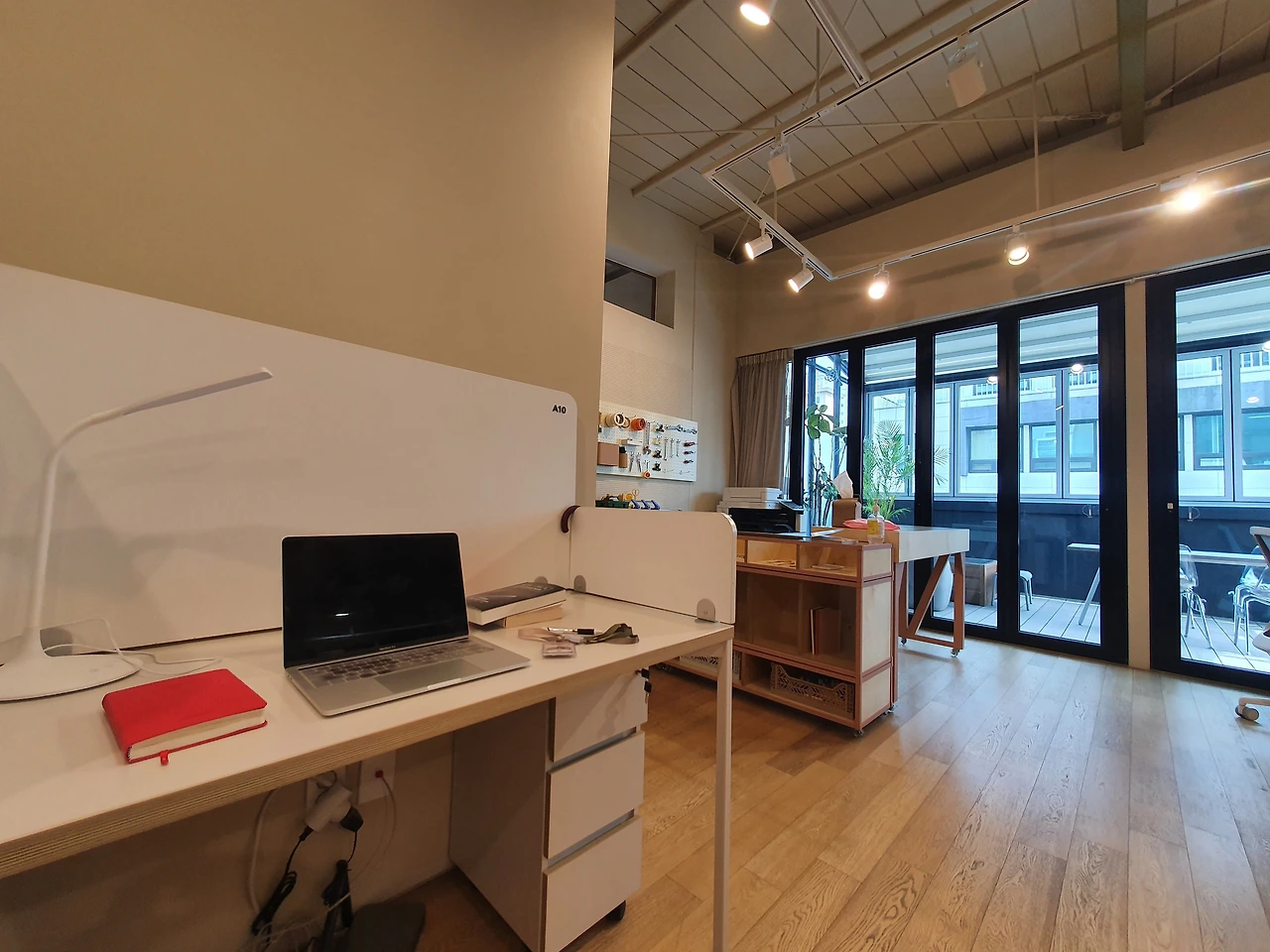 우선 업무 공간은, 리셉션에서 발급받은 카드키를 통해서만 입장이 가능하다. 내부에는 1인용 지정석이 10개 정도 마련되어 있고, 이 외에도 업무에 필요한 오피스 도구 및 프린트기도 배치되어 있다. 필요시, 외부 테라스 좌석에서도 4명 정도의 인원이 함께 업무를 할 수 있는 공간도 갖춰져 있다.