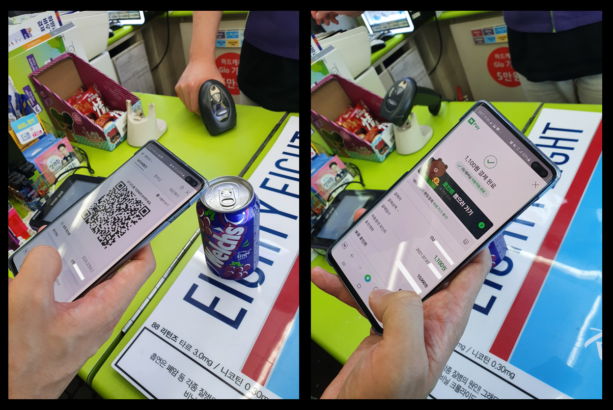 <CU 편의점에서 N Pay 현장결제 사용중인 모습>