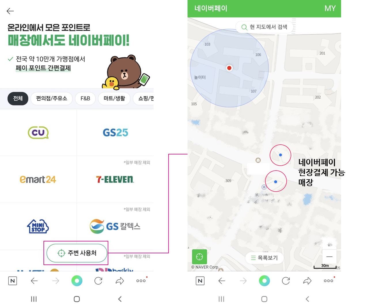 <'주변 사용처’ 기능을 활용해 인근 네이버페이 가맹점 확인 가능>
