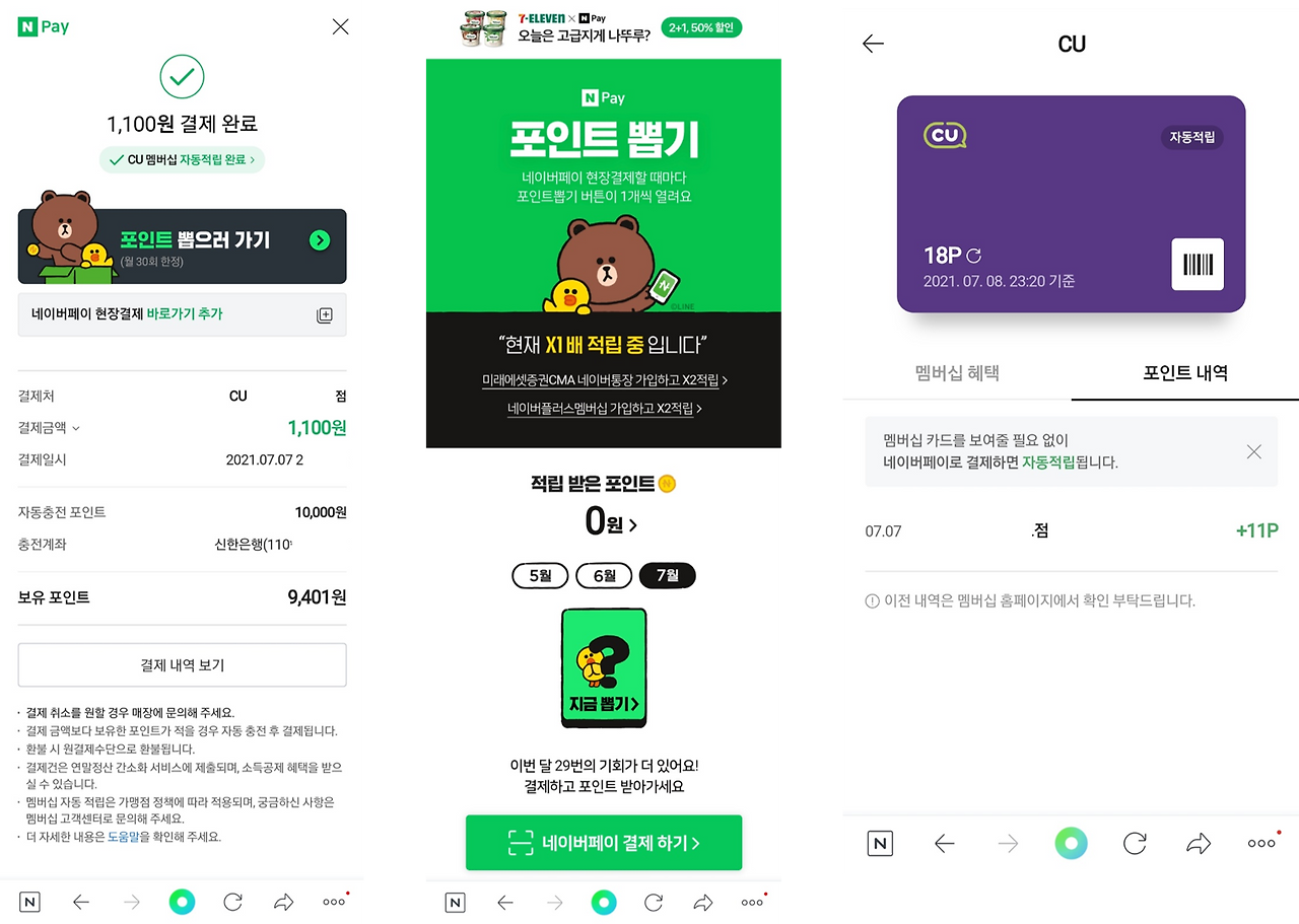 <N Pay 결제완료 화면 및 N Pay 내 CU 멤버십 포인트>