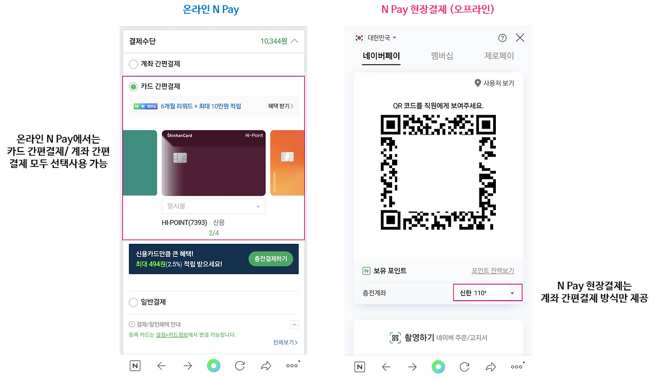 <(좌) 온라인 N Pay: 카드 간편결제, (우) N Pay 현장결제 계좌: 간편결제 방식>