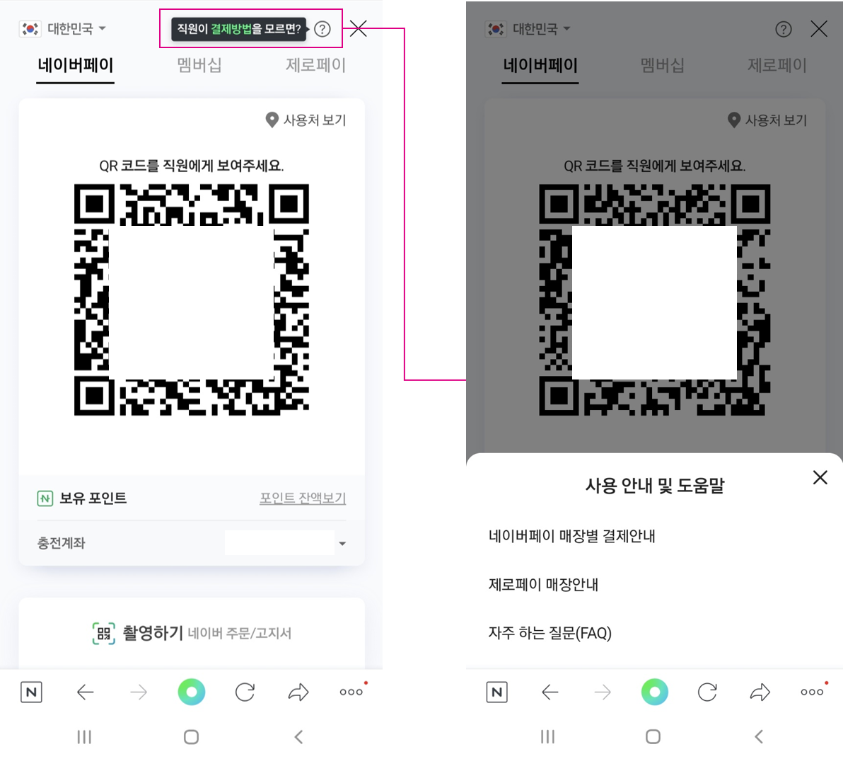 세 번째는 편의점 매장 직원이 N Pay 오프라인 결제 시 원활한 대응을 해줄지에 대한 의문이었다. 물론 해당 직원이 기기에 친숙한 경우라면 다행이겠지만, 혹여나 N Pay 결제 방식에 익숙지 않은 경우라면 또 여러 가지 번거로운 일들이 일어날 것으로 예상되었기 때문이다. 하지만 놀랍게도 N Pay QR 코드 화면 상단에는 ‘직원이 결제 방법을 모르면?’이라는 팝업 메시지가 노출되었고, N Pay 현장결제 사용자가 직접 매장 직원에게 결제 방식을 안내할 수 있도록 하는 결제 안내 및 도움말이 제공되고 있었다. 반드시 매장 직원이 모든 결제 방법을 숙지하고 있어야 한다는 고정관념을 깨고, 직원이 결제 방식을 모르는 경우 고객이 먼저 해당 직원에게 방법을 알려줘도 되지 않을까? 하는 고민에서 시작한 새로운 방식의 접근이었다.