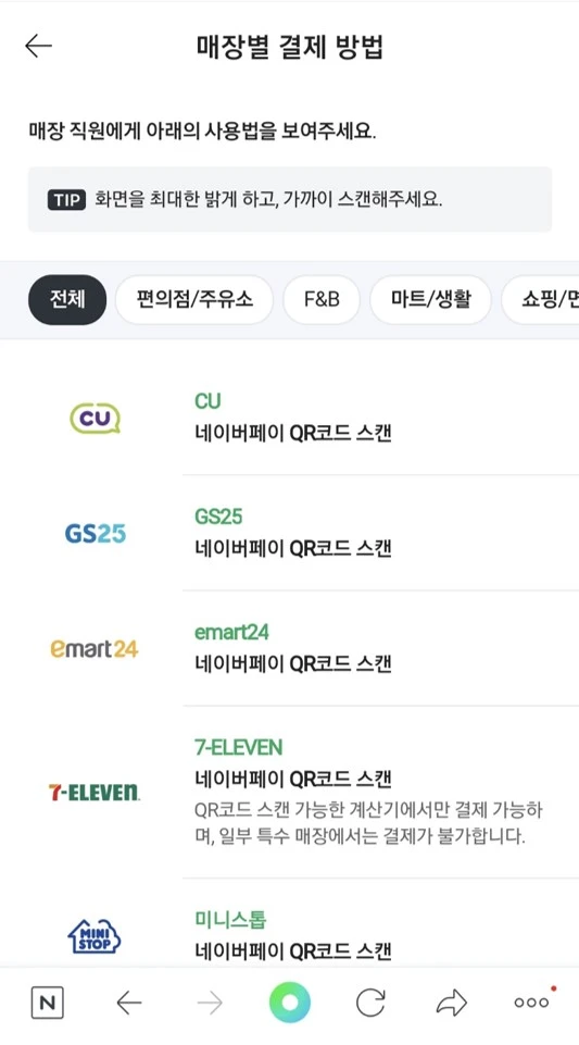 두 번째는 편의점 내에서 N Pay 결제가 어떤 방식으로 진행되는지가 궁금했다. 특히 과거에도 편의점에서 카드나 현금이 아닌 이 외 많은 결제 방식을 시도했지만 원활히 진행되었던 적이 많지 않았던 탓에 더더욱 우려가 되는 부분이었다. N Pay 현장결제 기능에서는 ‘매장별 결제 방법’을 세심하게 안내해 줌으로써 이러한 필자의 우려를 해소시켜 주었다. 각 가맹점에서의 결제 방식을 결코 복잡하게 설명하지 않고, N Pay 사용자 입장에서 알아야 하는 최소한의 결제 방법만이 제시되고 있었다.