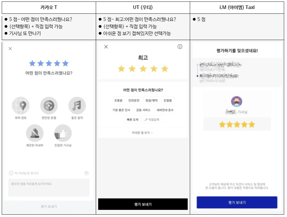 금일은 카카오 T, UT, i.M Taxi 플랫폼사들이 승객들의 적극적이고 솔직한 피드백 수집을 위해 어떠한 고객 경험(UX)을 제공하고 있는지 살펴보고자 한다.