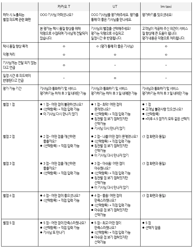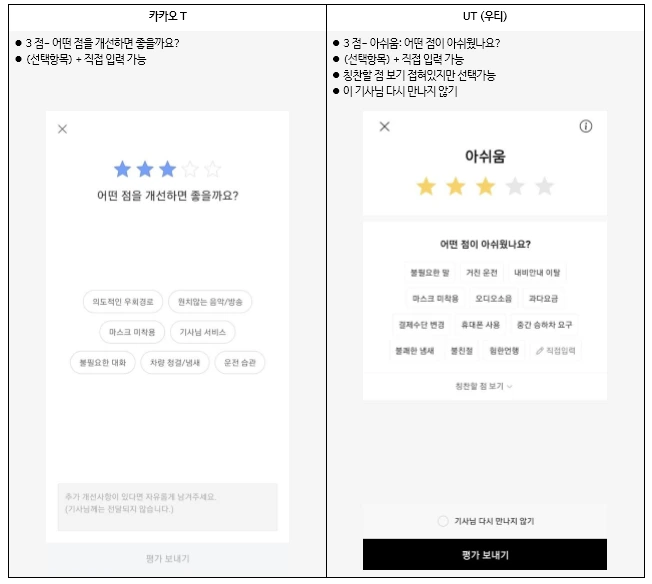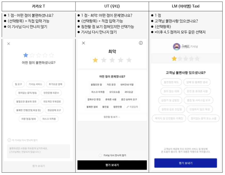 피드백을 하기로 마음먹은 승객이 최대한 빠르고 간편하게 의견을 제출할 수 있도록 세 개의 플랫폼사 모두 화면 자체를 매우 단순하게 설계해 두었다. 우선 카카오 T와 UT의 경우 1점 단위로 최대 5점까지 별점 평가가 가능하며, 선택한 별점에 따라 선택 옵션들이 다르게 노출된다. i.M Taxi의 경우 0.5점 단위로 평가가 가능하며, 5점을 제외한 나머지 별점에서는 동일한 평가 옵션을 제공한다.