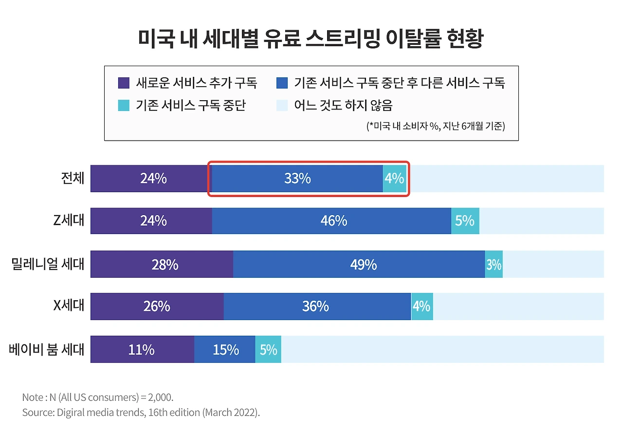 또 컨설팅 기업 딜로이트가 2022년 3월 발표한 설문 결과에 따르면 미국 OTT 고객 중 37%가 지난 6개월 이내에 구독을 중단하거나 경쟁 서비스로 옮겼습니다.