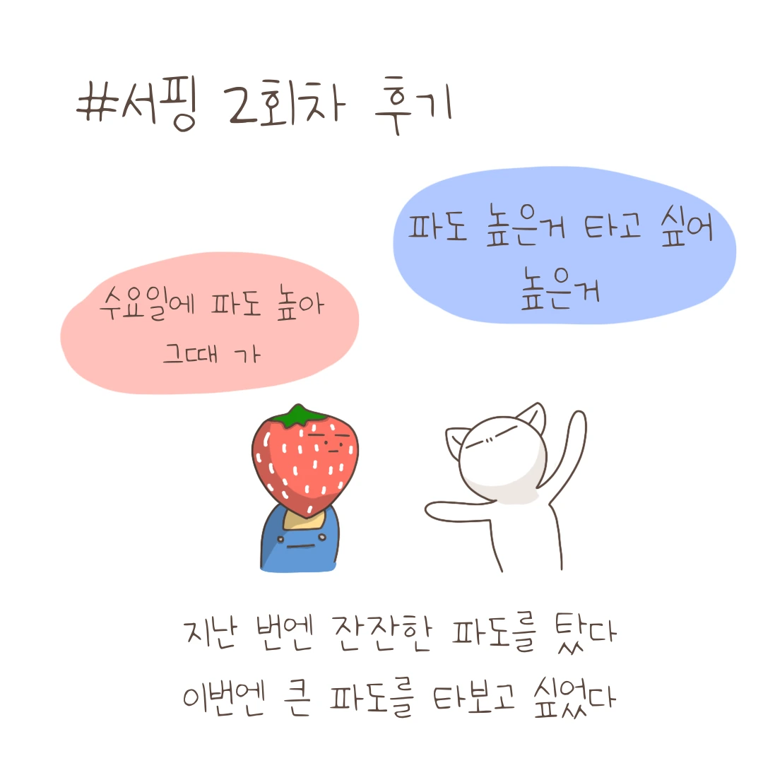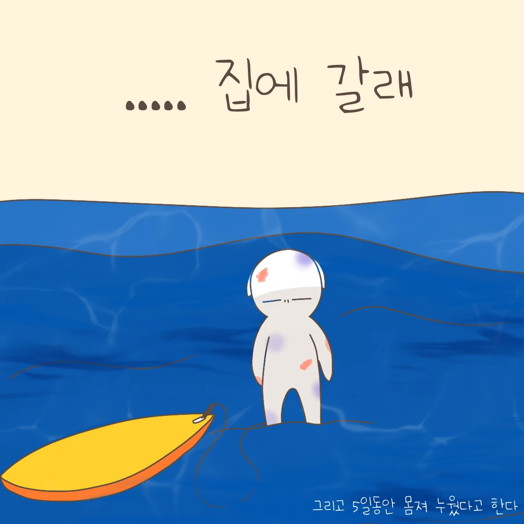 이 날은 물도 많이 먹고 멍도 많이 들고 머리도 많이 맞고 체력도 많이 쓰고 무서움도 많이 탄 그런 날이었습니다. 그래도 다시 서핑하러 갈 계획입니다. 인간은 망각의 동물이니까요. 그렇지만 소개 해준 친구도 만약 2회 차에 이런 파도였으면 서핑 관뒀을 거라고 하더라고요.