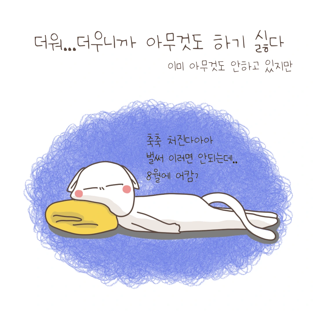 월요일에도 쉬었으니 그림은 그려야겠고, 더워서 의욕은 나지 않고. 지금의 나를 그려본다. 장마가 채 끝나기도 전에 오는 이 무더위는 무엇인가. 과연 8월에 장마가 끝나고 본격적으로 더워지기 시작하면 나는 살아남을 수 있을 것인가. 하루 종일 누워서 퍼져있는 우리 집 고양이 멍코를 따라 나도 한껏 늘어져 있는다.