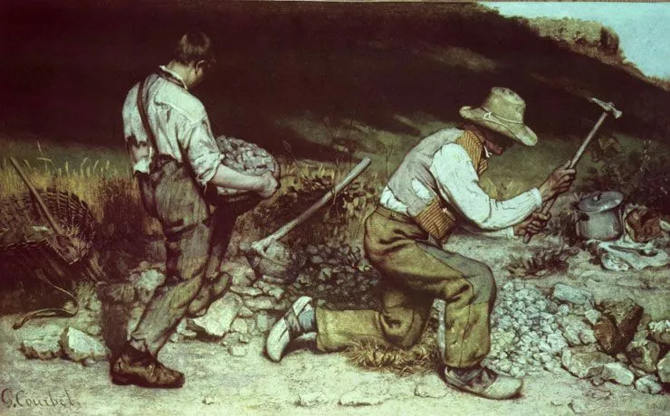 위의 두 작품을 그린 밀레와 쿠르베 모두 동시대에 활동한 사실주의 화가입니다. 하지만 사실주의에 대한 태도는 둘이 조금 다른 점이 있습니다. 밀레의 대표작 <이삭줍기>와 쿠르베의 <돌을 깨는 사람들> 둘 다 멋지고 낭만적인 모습을 그린 것이 아니라 당시 서민들이 노동하는 모습을 그려냈습니다.