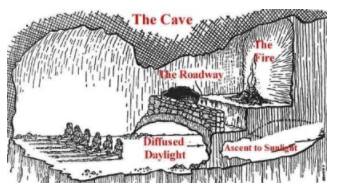 동굴에서 쭉 살았다. 모닥불에 비친 사람의 그림자가 그게 곧 우리의 모습이였다. 근데, 소크라테스가 동굴에서 나갔다. 소크라테스는 말했다. "그거 우리 모습 아냐." 하지만 우리는 그의 의견에 여전히 이해가 되지 않는다. 함께 지내던 사람들도 말한다. '모닥불에 비친 사람의 그림자가 우리 모습이라고.", "소크라테스가 이상하다."