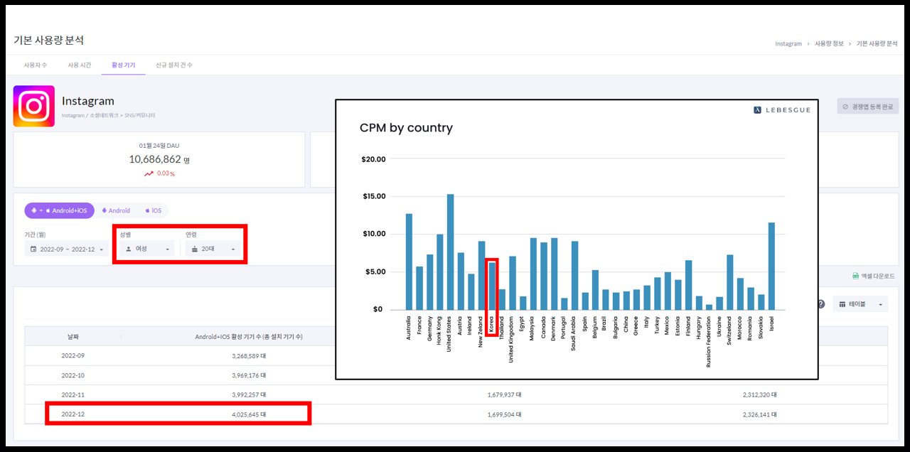 위 모바일인덱스의 이미지에 따른 20대 여성 중 인스타그램을 사용하는 유저의 기기 수는 400만대로 추정되는데요.