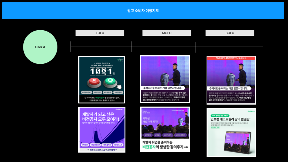 User A는 TOFU, MOFU, BOFU라는 퍼널의 메세지를 통해 우리 서비스에서 전환을 할 수 있고, User B는 TOFU, MOFU의 메세지만을 통해 전환을 할 수 있고, User C는 Bofu만을 통해서 전환을 할 수 있게 되지요.