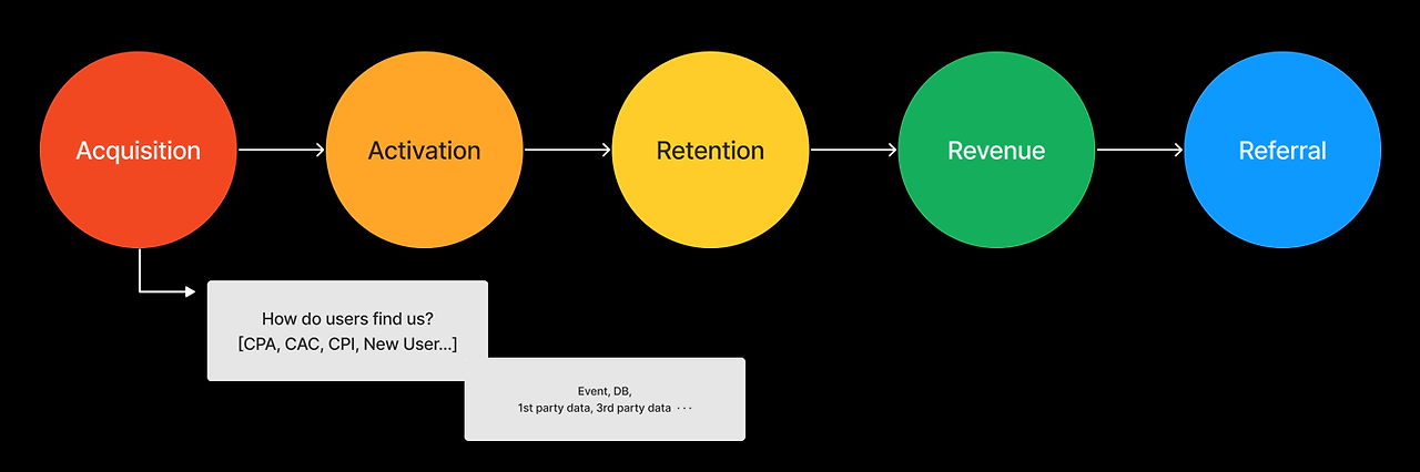 위 이미지를 통해 그로스해킹에서 대표적으로 사용되는 해적지표 AARRR에 따르면, 가장 첫 단계인 Acquisition이 있다는 것을 알 수 있습니다.