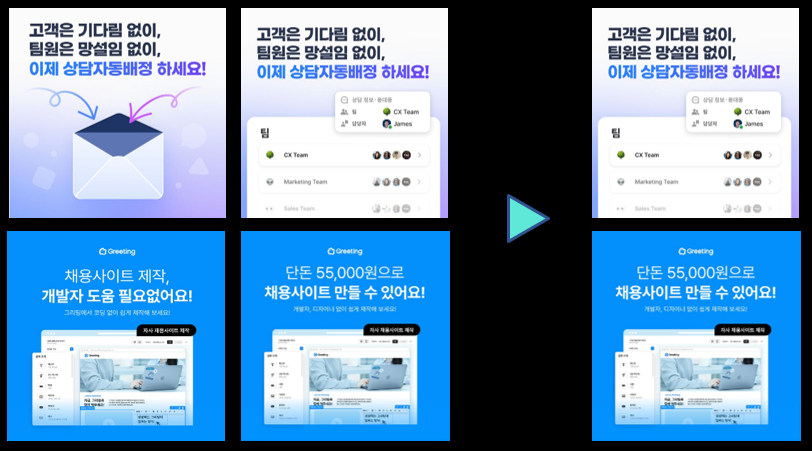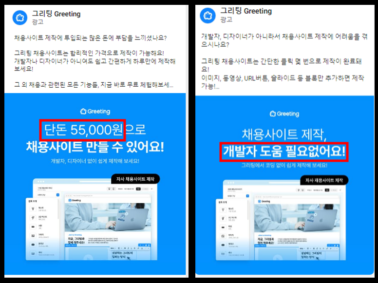 두번째 이미지의 경우에는 개발자 도움이 없이 채용사이트를 제작할 수 있다는 메세지를 담았고, 이 메세지는 고객에게 Manpower saving(인력 절약)이라는 가치를 전달하고 있습니다.