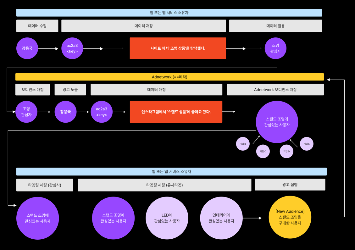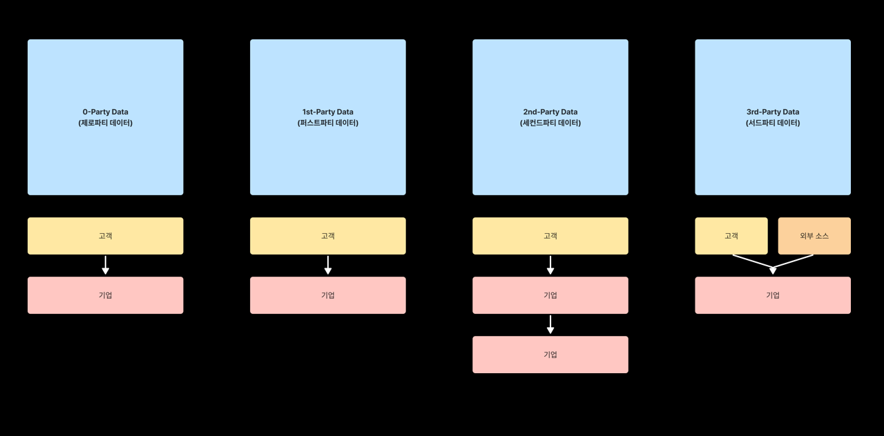 이러한 데이터는 퍼스트파티 데이터, 서드파티 데이터, 이벤트, 쿠키, 기기ID 등 여러 형태가 있고, 이렇게 저장된 데이터를 바탕으로 기업은 비즈니스 분석부터 마케팅 활용까지 여러가지 전략을 구사할 수 있게 됩니다.