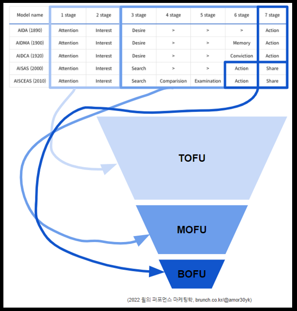 위 이미지에 나타나는 것처럼, 역사적으로 소비자 여정지도는 잠재고객이 여러 단계를 통해 우리가 원하는 행위를 달성한다는 것을 알려주는 연구인데요. 우리는 선구자의 연구를 통해 사회적으로 정의된 AIDA, AIDMA, AISAS 모델을 공부함으로써 각각의 단계 별로 어떻게 마케팅을 하면 좋을지에 대한 인사이트를 얻을 수 있습니다.