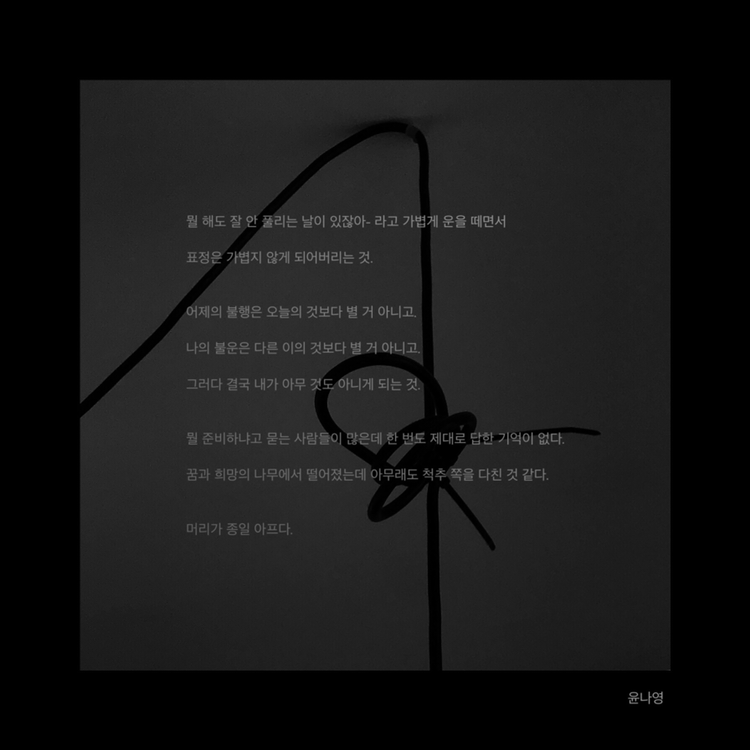 뭘 해도 잘 안 풀리는 날이 있잖아- 라고 가볍게 운을 떼면서 표정은 가볍지 않게 되어버리는 것. 어제의 불행은 오늘의 것보다 별 거 아니고. 나의 불운은 다른 이의 것보다 별 거 아니고. 그러다 결국 내가 아무 것도 아니게 되는 것. 뭘 준비하냐고 묻는 사람들이 많은데 한 번도 제대로 답한 기억이 없다. 꿈과 희망의 나무에서 떨어졌는데 아무래도 척추 쪽을 다친 것 같다. 머리가 종일 아프다.