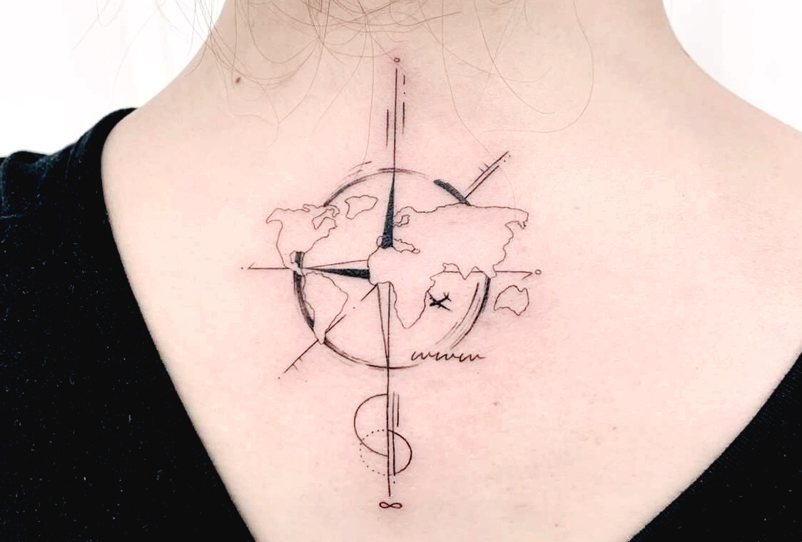 등뒤에 세계지도, 무한대, 나침판, 비행기, www 등이 생겨져 있는 타투다. 나의 존재 의미를 다시 한번 생각하며 어떤 내용을 넣을까 아주 오랜 시간 고민하고 만든 그림이다. 내 삶에서 가장 중요한 건 나 자신이지만, 나를 이유 없이 사랑해 주고, 지탱해 주는 가족들이 있기에 모든 것이 가능하다는 의미로 어떤 타투로 새길까 고민했었다.