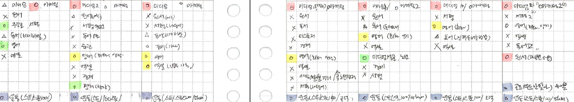 매일 아침 나의 루틴은 To-do list를 적는 것이었다. 업무적으로 개인적으로 해야 할 일을 적고 앞에다 O, X로 완료 여부를 표시했다. 완료한 일은 O 표시와 함께 형광펜으로 칠했다. 아래는 나의 주간 바인더의 일부다. 딱 보기에도 성공률이 높지 않다. 할 일들은 조금씩 바뀌었지만 형광펜이 칠해진 O의 비율은 비슷하다.