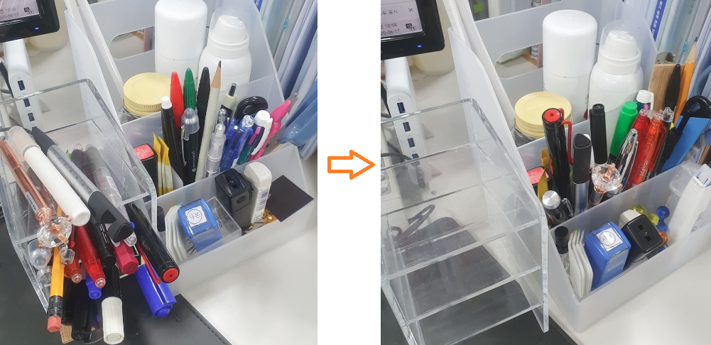 [실행]기존에는 미스트 2개, 유산균, 가위, 칼 2개, 빨간펜 2개, 검정펜 9개, 플러스펜 3개(색깔별), 3색 펜 5개(검은색만 다 쓴 것 2개), 만년필 2개(굳어서 안 나옴), 네임펜 2개(검, 파), 매직 2개(검, 파), 붓펫(왜..?), 화이트, 자 2개, 어제 정리한 형광펜 2개(기존 8개), 지우개, 도장 2개, 자석, 포스트잇 플래그... 등이 있었다. 선물 받은 것들과 자주 사용하는 것들만 남기고 공용 물품함에 다시 넣어 두거나 폐기했다.