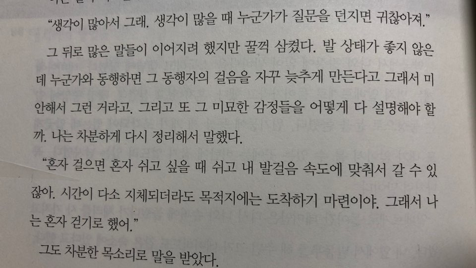 하여 추락하지 않기 위해 걷는 것을 선택한 저자의 길은 어떤 의미를 갖는가? 오롯이 걷는 것에 집중한다는 것, 그것도 홀로. 묵묵히 버텨내는 삶. 나는 걸을 수 없다는(뭐, 휠체어를 탄다는 것 역시 나름 걷는 것이지만) 그러한 고행의 짜릿함을 알 수 없음이 안타깝긴 하지만 굳이 길 위에서만 걷는 것은 아니기에, 저자가 말한 '포기하지만 않는다면 언젠가는 목적지에 도착한다는 것', 그리고 '내 걸음걸이 속도를 인정한다는 것'은 내 인생이란 길 위에서도 같을 것이다.