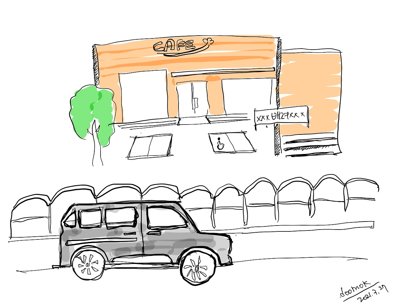 운전하며 지나치느라 사진을 찍진 못했지만 입구 앞 주차장 현수막에 카페 주인의 따뜻한 마음이 담겼다. 이곳은 커피도 진하고 향기로울 게 확실하다. 한데 고마우면서도 한편으로는 저렇게라도 말하지 않으면 누군가의 불편이 계속되리라 생각하니 씁쓸했다.