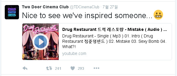 실제로 Drug Retraurant는 표절이 아닌 Two Door Cinema Club에게 영감을 받았거나 작곡 중 무의식적으로 비슷한 곡을 만들 었을 수도 있다. 작곡을 위해서는 수많은 음악을 들어봐야 하기 때문이다. 또한 누군가에게는 이 두 곡은 닮지 않았을 수 도 있다. 때문에 이에 대한 판단은 개개인에게 돌아간다. 문제의 Drug Restraurant의 Mistake와 Two Door Cinema Club의 Someday의 인트로를 한번 들어보자.