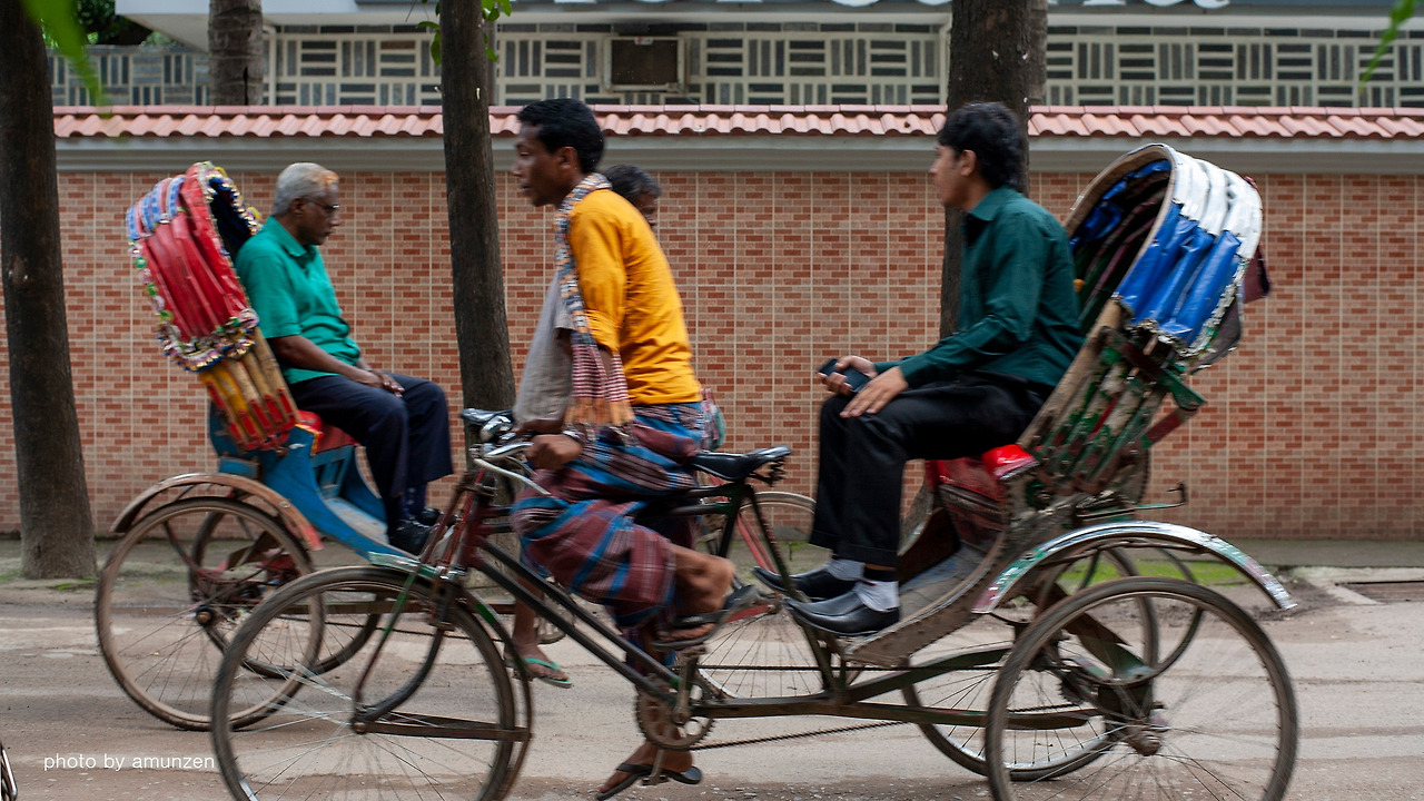 방글라데시 수도 다카(Dhaka)를 여행하면 우리의 눈길을 끄는 것은 릭샤(Rickshaw)와 꿀리(Coolie)이다. 요즘 릭샤란 관광이나 색다른 오락거리 일부이나, 세계 최빈국 중 하나인 방글라데시는 다르다. 대중교통체계가 미흡한 인구 1.2천만 다카는, 단거리 이동은 릭샤라 불리는 인력거가 공식 집계하는 교통수단이다. 다카 시내에는 등록된 60만 대, 비공식적인 수를 포함 120만 대의 릭샤가 공공버스나 승용차보다 월등히 많은 교통 분담률 38% 달한다.* 설령 자동차가 있다고 할지라도 통행속도가 6.7Km에 불과해, 오히려 좁은 골목길을 달리 수 있는 릭샤가 유용한 교통수단이라 할 수 있다.