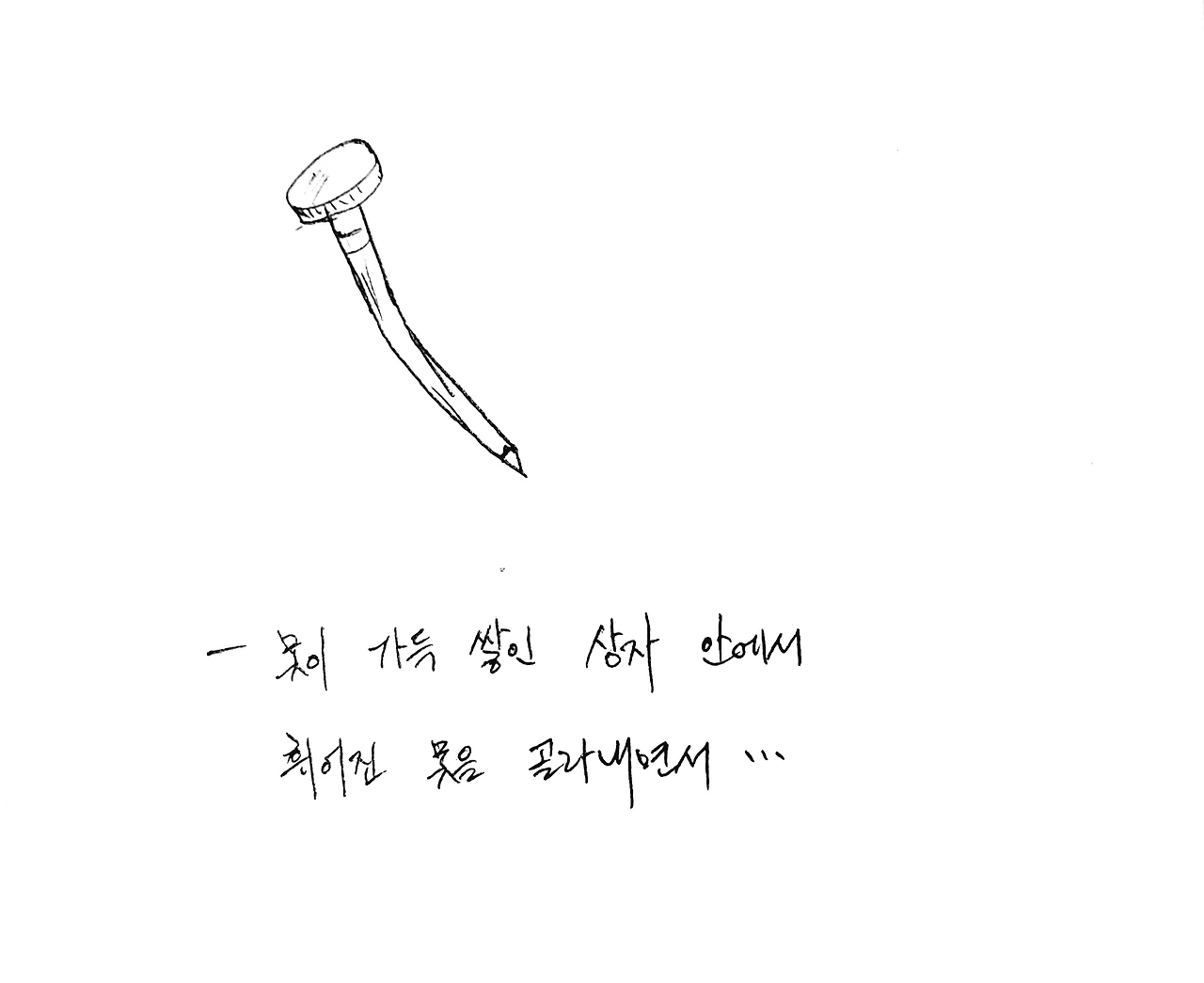 버려두지도 못하고 못 상자에 다시 담아두었던 휘어진 못들에 대해 생각해 봅니다. 그런 못들의 지나간 나날이 우리 가슴속엔 너무도 많아서 문득 다시 꺼내보며 바라보게 되는, 빗나간 망치가 내려친 곳들. 휘어진 못들을 골라낸다면 우리는 다시 새롭게 시작할 수 있을까요.