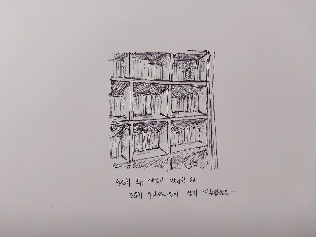 그리고 누군가에게 빌려온 문장들을 하나하나 내 것으로 받아들일수록, 서가에 꽂힌 책들처럼 왠지 더 세상에 대해 함부로 말할 수 없을 것 같은 기분. 우리가 세상에 태어나 빌려 입고 있는 이 육체는 조금씩 귀퉁이가 닳고 낡아가는 페이지들. 성실히 쓰고 깨끗이 반납한 뒤, 언젠가 조용히 돌아설 수 있기를. 인생의 여운을 느끼며 저물어가는 삶의 책장 마지막을 덮고 천천히 걸어 나올 수 있기를.