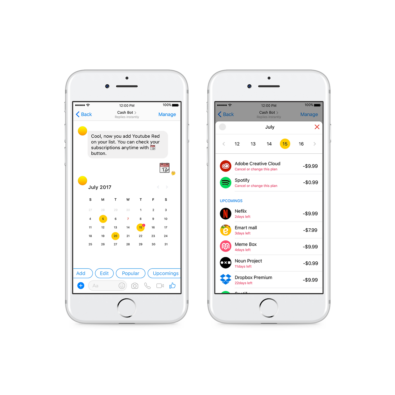 이번 프로젝트는 매월 정기결제 서비스들의 자동 결제 문자를 받을 때마다 "오늘이 정기결제 날일 줄 알았다면 플랜을 바꾸거나 취소했을 수도 있을텐데!"하는 아쉬움에서 출발한 프로젝트입니다. 온라인 정기결제를 똑똑하게 관리하기 위한 챗봇 "Cash Bot" 의 가상 Mock-up 디자인 작업 과정을 공유합니다.