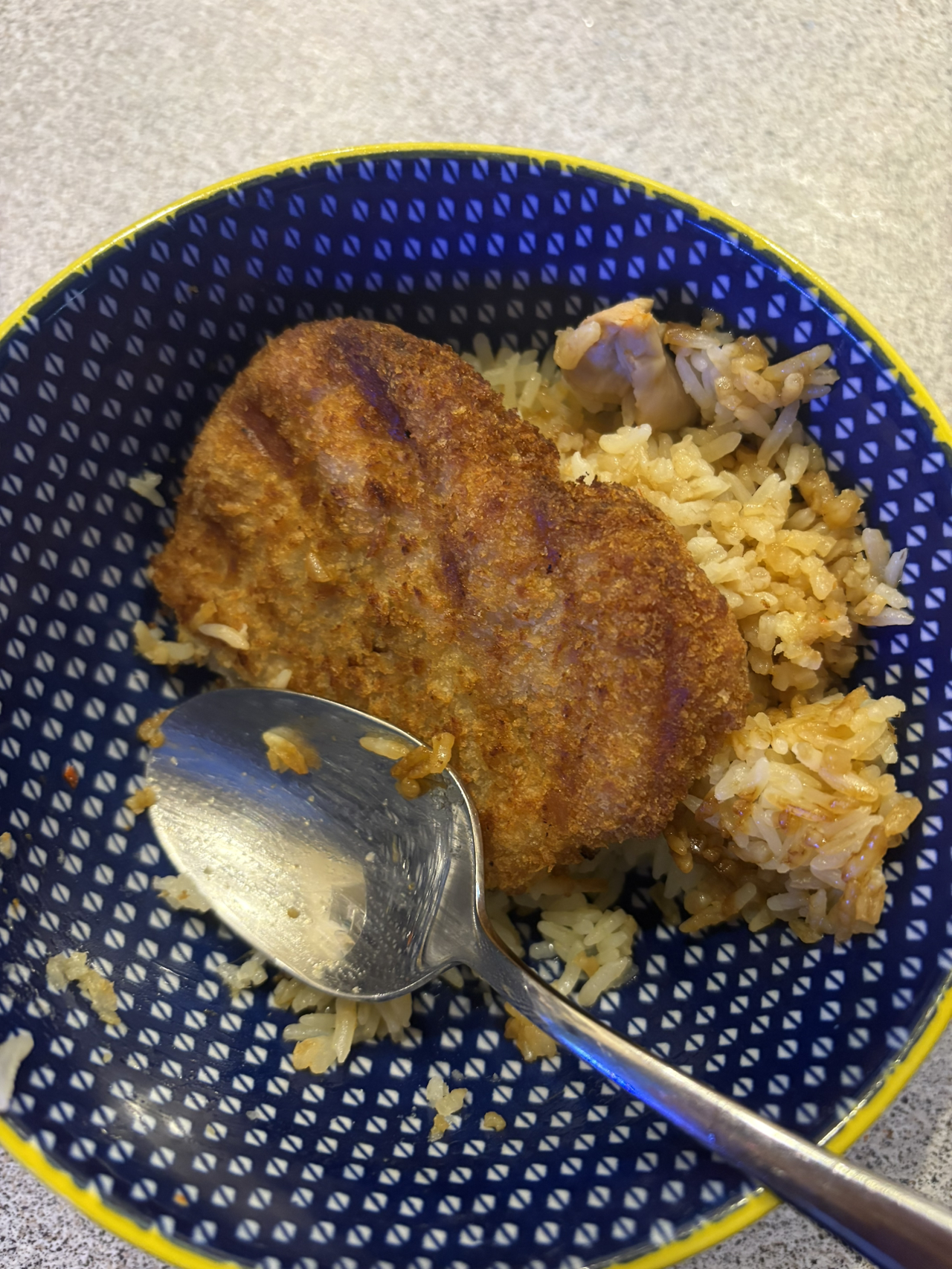 밥 있을 때 많이 먹어야 해서 남은 밥을 먹었다. 저 돈가스 비슷한 건 맛이 없었는데 그냥 먹었다. 다 먹고 막내 공주가 자전거 타러 나간다고 해서 할머니랑 같이 따라갔다.