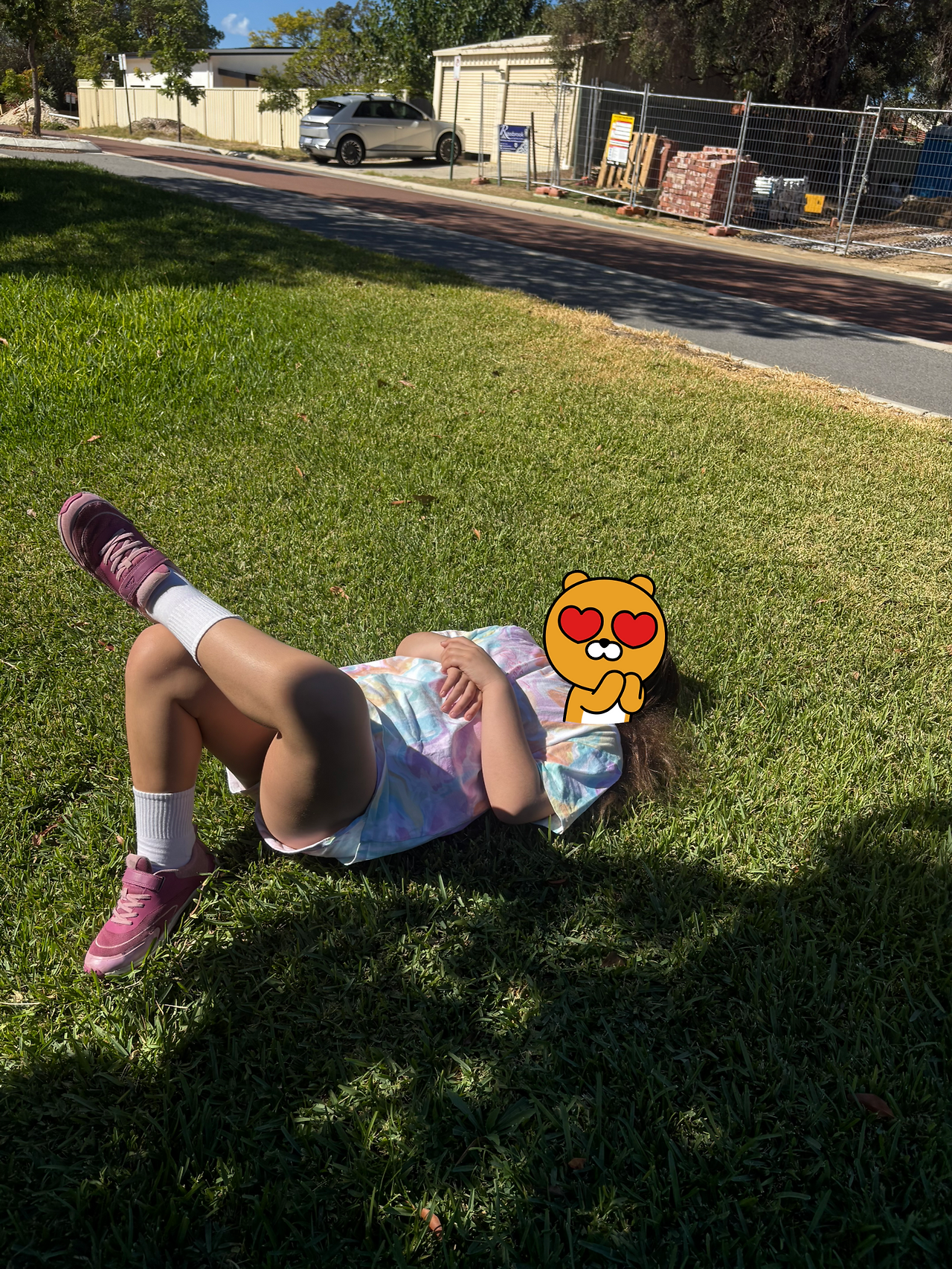 학교 가는 길을 알려준다고 다 같이 걷는데 이 잔디가 너무 좋다고 눕는 둘째 공주.