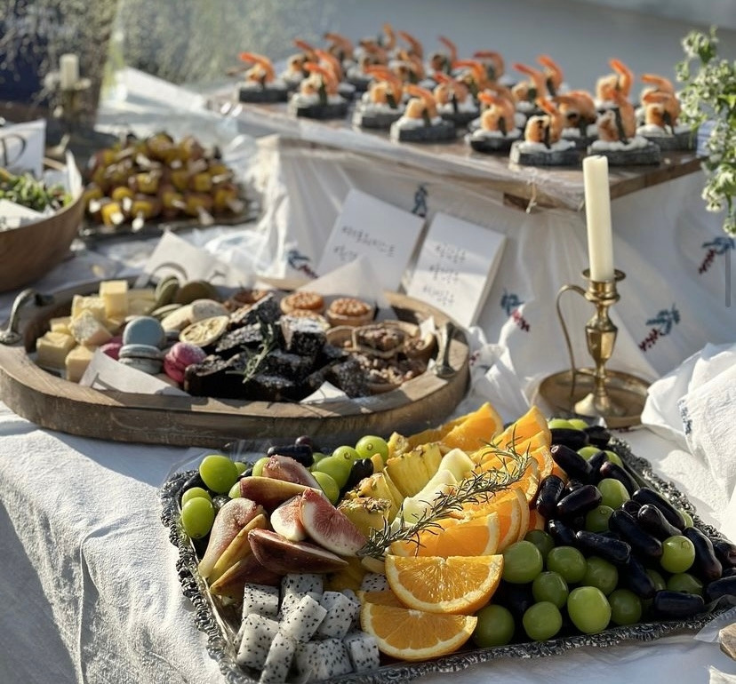 처음에는 흔히들 야외 결혼식하면 떠올리는 ‘야외 스텐딩 셀프바’ 형태를 구상했다. 핑거푸드, 쿠키 같은 간단한 디저트류와 음료로 구성된 감각적인 테이블 말이다.